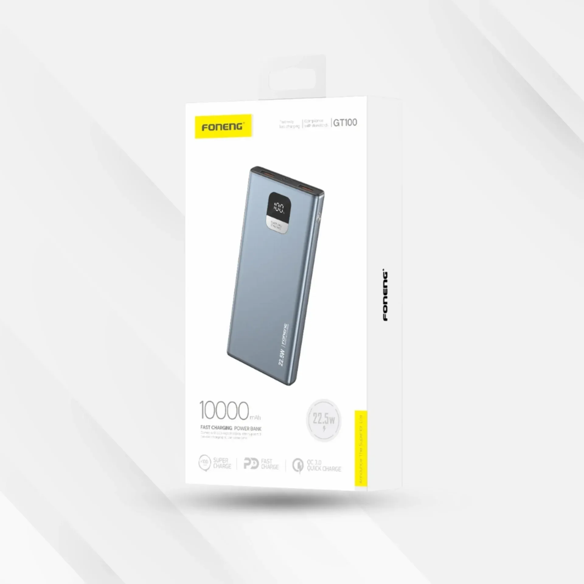 باوربانك قوي من شركة FONENG بسعة عالية وتصميم عملي، يوفّر شحنًا سريعًا وآمنًا مع إمكانية شحن أكثر من جهاز في نفس الوقت، مناسب للاستخدام اليومي والسفر. ( المميزات ) | 🔋 - سعة كبيرة 20000mAh تشحن جهازك أكثر من مرة ⚡- شحن سريع بقوة تصل إلى 22.5W 🔌- ثلاث مخارج لشحن 3 أجهزة في وقت واحد 📱 - متوافق مع أغلب الهواتف والأجهزة الذكية 🛡️ - حماية ذكية من الشحن الزائد وارتفاع الحرارة ✨- تصميم أنيق وقوي مناسب للتنقل ( المواصفات ) | الموديل: FONENG GT200 النوع: باوربانك / شاحن محمول السعة: 20000mAh قدرة الشحن: حتى 22.5W المدخلات: Micro USB / Type-C المخارج: USB-A ×2 / Type-C ×1 الوزن: حوالي 473 جرام اللون: رمادي