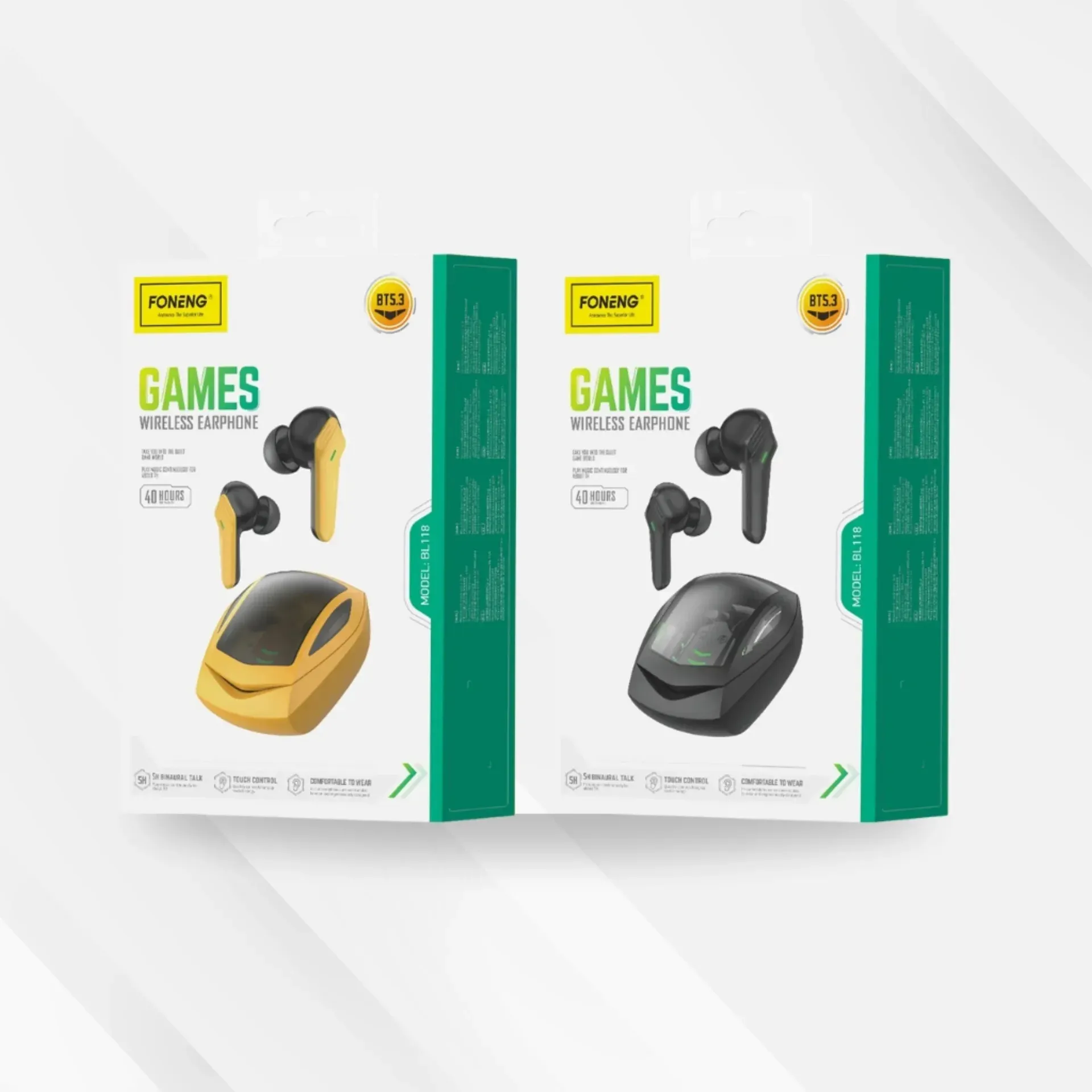 سماعات FONENG BL118 بتصميم مريح وتقنية بلوتوث متطورة توفر لك تجربة صوتية ممتازة، مثالية للموسيقى والمكالمات وحتى الألعاب بفضل زمن استجابة منخفض. (المميزات) | 🎶- صوت ستيريو واضح وجودة ممتازة 📶- Bluetooth 5.3 لاتصال سريع ومستقر ⏱️ - تشغيل موسيقى حتى 7 ساعات بشحنة واحدة 🔋- تشغيل إجمالي يصل إلى 40 ساعة مع علبة الشحن 🎮- زمن استجابة منخفض مثالي للألعاب 🔌- شحن سريع بمدخل Type-C 🎧 - تصميم مريح يناسب الاستخدام اليومي ( المواصفات) | الموديل: FONENG BL118 النوع: سماعات أذن لاسلكية (TWS) نسخة البلوتوث: 5.3 وقت تشغيل الموسيقى: حتى 7 ساعات وقت الاتصال: حتى 5 ساعات مدة التشغيل مع العلبة: حتى 40 ساعة بطارية السماعة: 40mAh لكل سماعة بطارية علبة الشحن: 320mAh وقت شحن السماعة: حوالي 1 ساعة وقت شحن العلبة: حوالي 2.1 ساعة منفذ الشحن: Type-C
