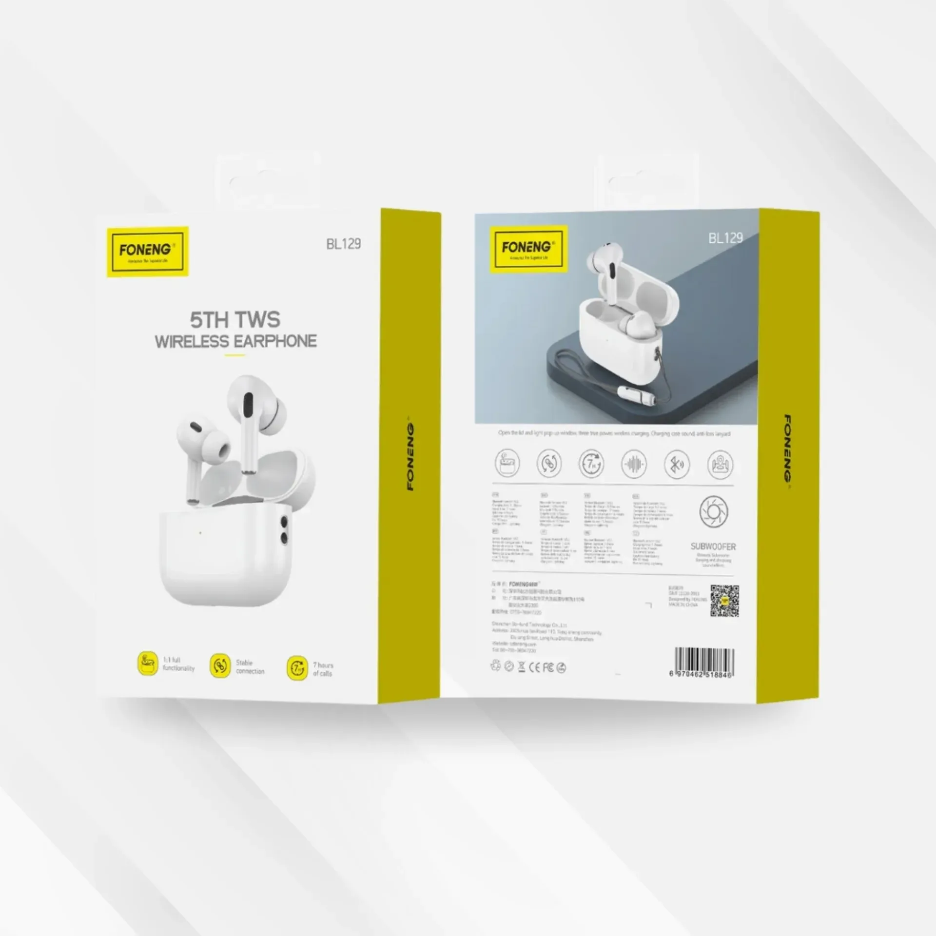 سماعات FONENG BL129 الجيل الخامس تأتي بتقنية TWS لتجربة صوتية محسّنة، اتصال بلوتوث مستقر، وتصميم مريح يناسب المكالمات والموسيقى والاستخدام اليومي. ( المميزات) | 🎶 - صوت واضح ونقي للاستماع اليومي 📶- Bluetooth 5.3 لاتصال أسرع وأكثر استقرار 🔋- تشغيل موسيقى حتى 6–7 ساعات بشحنة واحدة 🔋 - تشغيل إجمالي يصل إلى 15 ساعة مع علبة الشحن ⚡ - شحن سريع وعملي 📱 - تصميم خفيف ومريح للاستخدام الطويل 🎧 - مناسبة للمكالمات، الموسيقى، ومشاهدة الفيديو ( المواصفات) | الموديل: FONENG BL129 النوع: سماعات أذن لاسلكية TWS الجيل: الخامس (5th Generation) إصدار البلوتوث: 5.3 مدة تشغيل الموسيقى: حتى 6–7 ساعات مدة التشغيل مع العلبة: حتى 15 ساعة سعة بطارية السماعة: 35mAh لكل سماعة سعة بطارية العلبة: 230mAh وقت شحن السماعات: حوالي 1 ساعة وقت شحن العلبة: حوالي 2 ساعة مدى البلوتوث: حتى 10 أمتار منفذ الشحن: Lightning أو Type-C (حسب الإصدار)